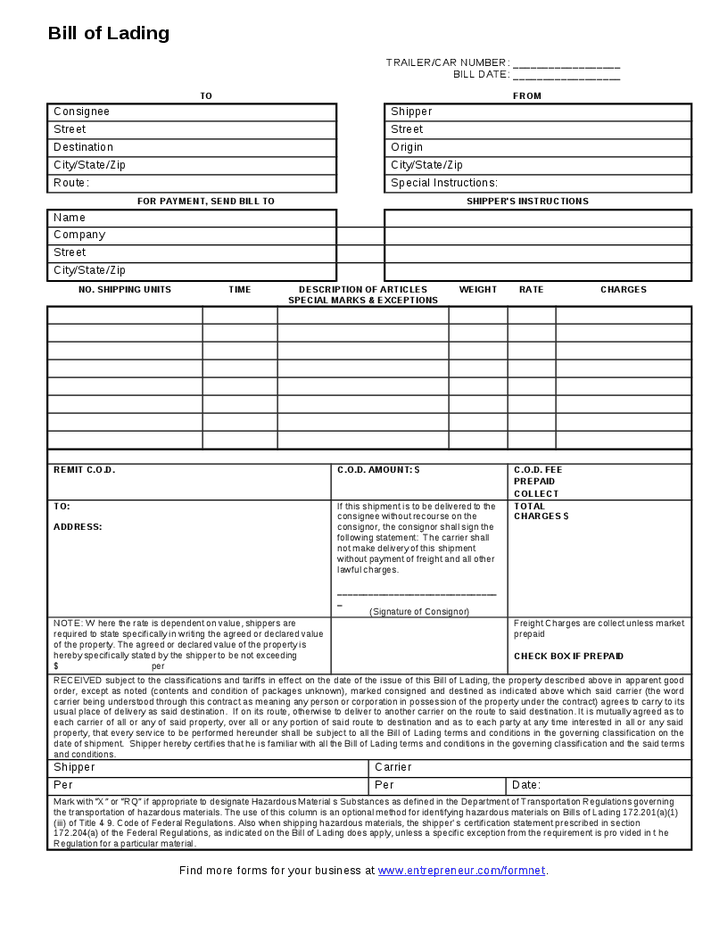 Bill Of Lading Form – FREE DOWNLOAD – Aashe