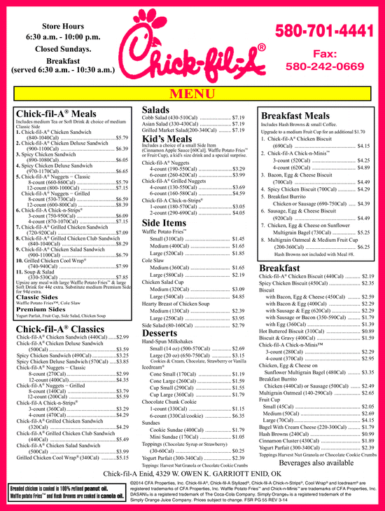 Chick-fil-A Menu, Menu For Chick-fil-A, Norman, Oklahoma City
