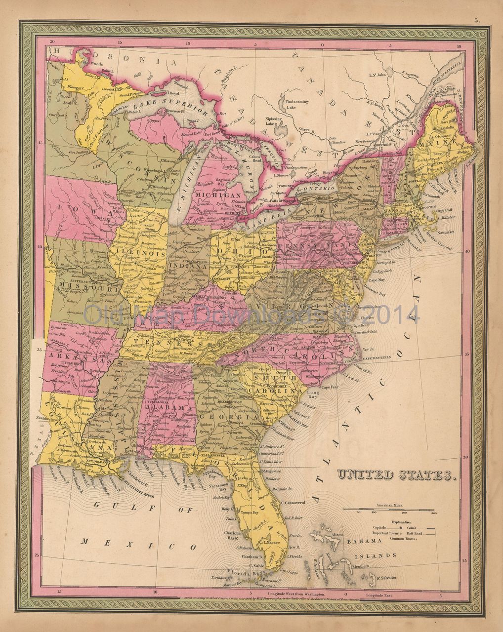 United States Of America USA Old Map Mitchell 1847 Digital Image Scan